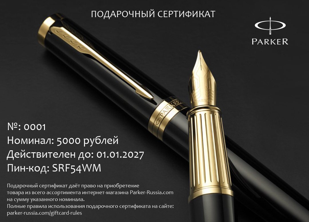Подарочный сертификат Parker 5000 от официального дилера Parker в Бийске. Вы можете дополнительно заказать гравировку, которая подчеркнет Вашу оригинальность и придаст памятность статусному подарку. Все ручки Паркер поставляются в фирменном футляре.